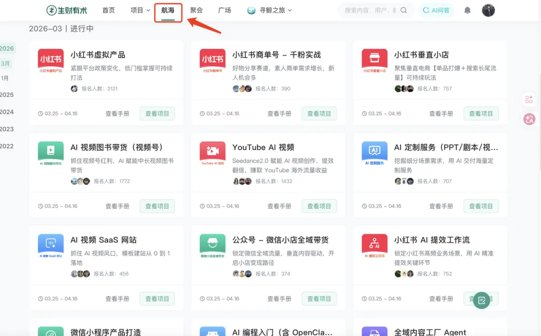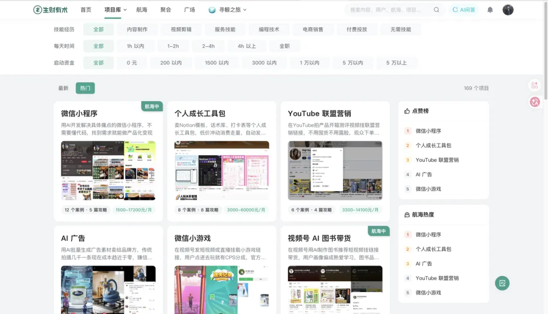 项目库里的项目,生财官方后续会从几百个里面筛选出十几个具有价值的,拿来开航海。所以如果你是高手,完全可以提前从项目库里挑你觉得有价值的先开始做,不用等。