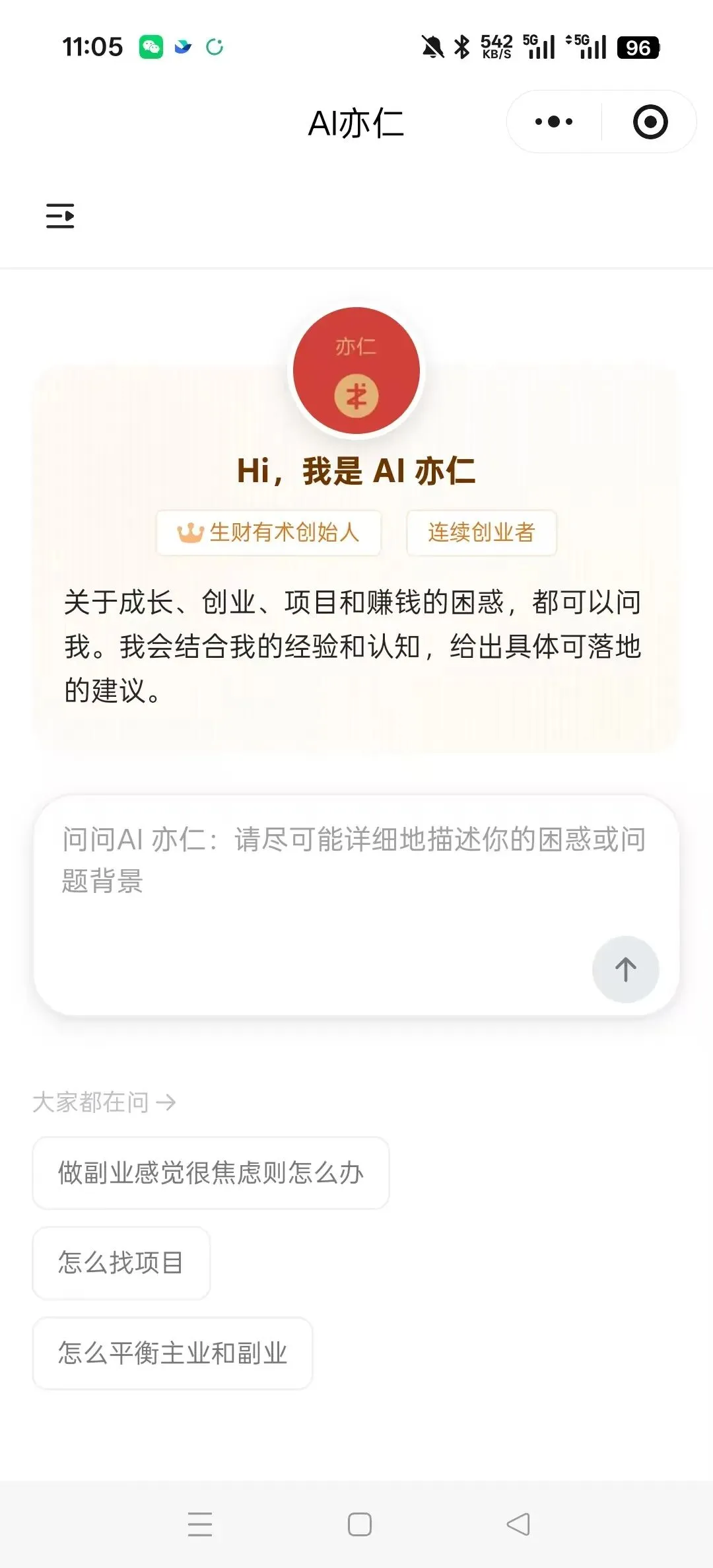 它目前的不足是不了解你,所以你一定要把你的背景交代得很清楚,或者搭配你日常使用的AI结合起来使用。目前为了大家使用便捷呢,已经上线了小程序版,直接在小程序搜索 AI 亦仁即可