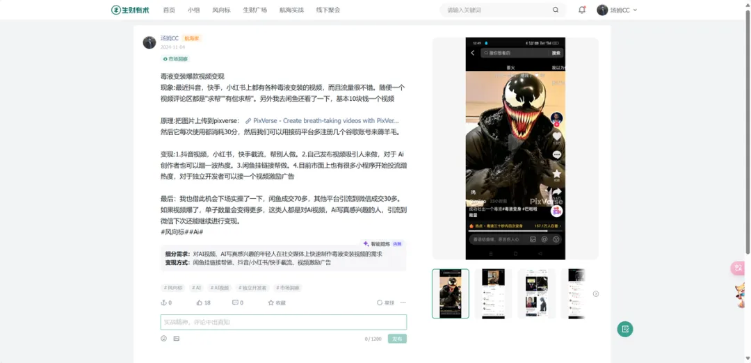 举个例子,我曾根据「毒液变装爆款视频」的风向标快速实操,我首先看到抖音评论有大量求代做的,需求很大,制作上也没有太大难度,于是在闲鱼上布局,很快就有正反馈,两天干了200+,也是我第一次尝试实操风向标。