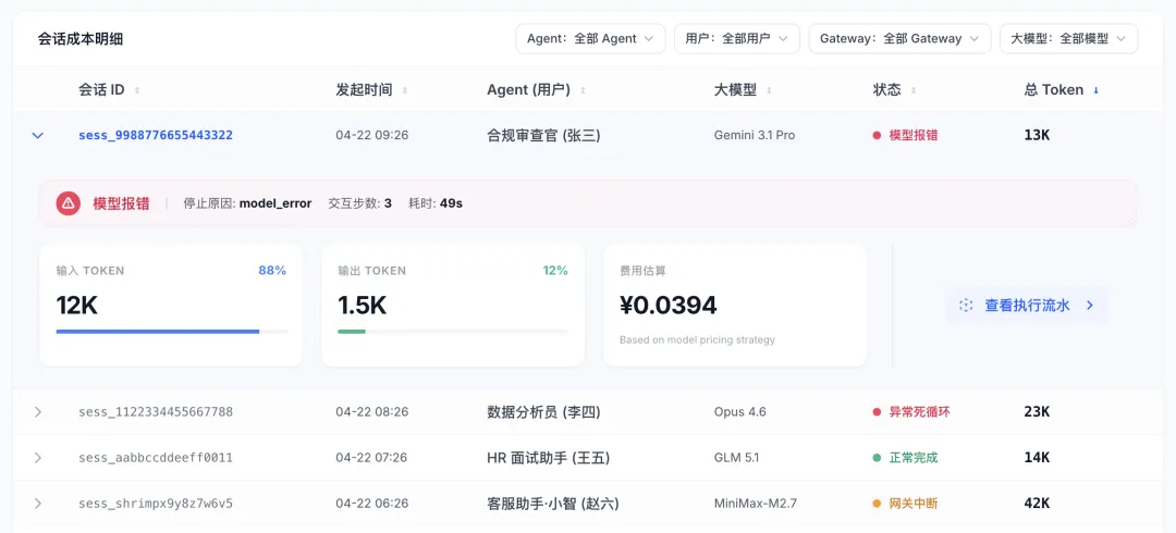 以前,对 OpenClaw 的成本是“后知后觉”的。每次看到账单,只能事后复盘问题来源。这种失控感,让管理层在面对 AI 规模化落地时往往更加谨慎——因为看不清风险,所以不敢放手。