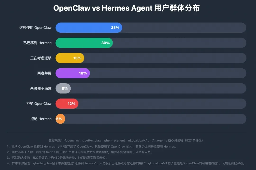样本来源偏差:r/better_claw 帖子本身主题是“迁移到 Hermes”,天然吸引已迁移或考虑迁移的用户;r/LocalLLaMA 帖子主题是“OpenClaw 的可用性质疑”,天然吸引批评者。