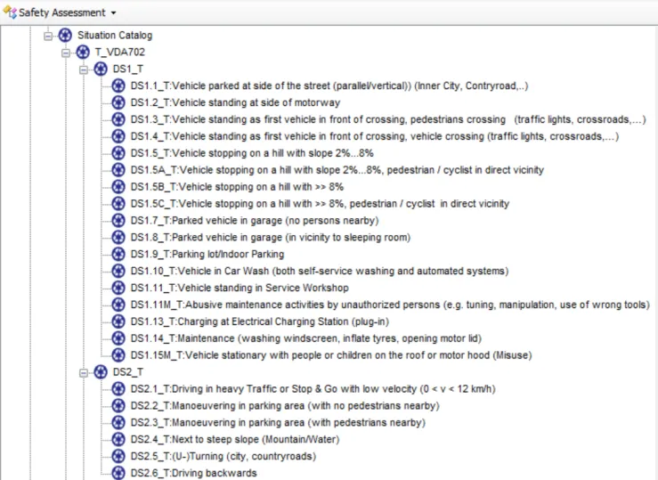 支持驾驶场景库,在考虑驾驶场景的前提下,定义整车级别及系统级别的危险。HARA分析模板内置预定义的VDA702场景库,如下图所示: