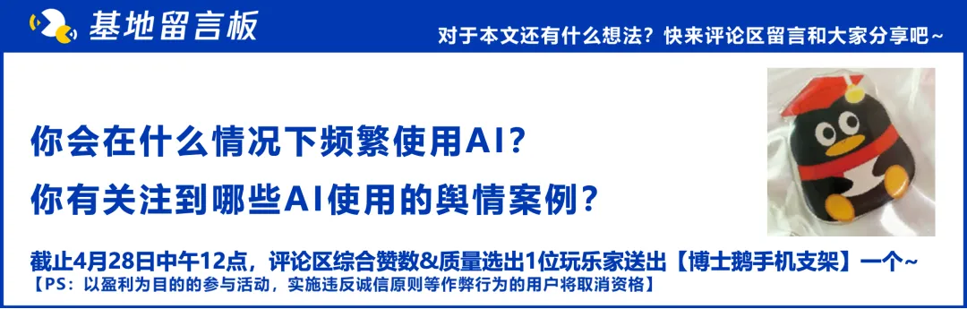 总体来看,大家并不是简单地“反对使用 AI ”,而是在逐渐划出一条属于自己的边界:当任务只是追求效率和结果时,AI 可以成为很好用的工具;但当事情关乎思考、情感和责任时,人们更希望把主动权留在自己手中。因为这些部分不仅决定了事情的结果,也构成了人与人、人与世界之间真实的连接。或许真正重要的并不是“AI 能不能做”,而是我们愿不愿意把这些本该属于人的部分交出去。