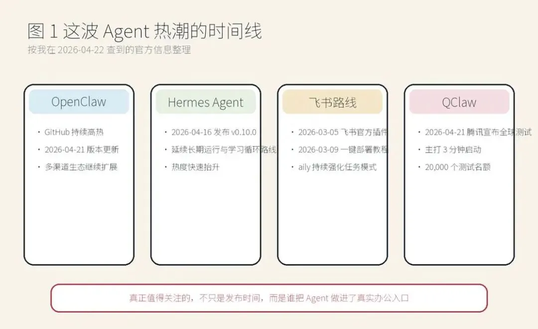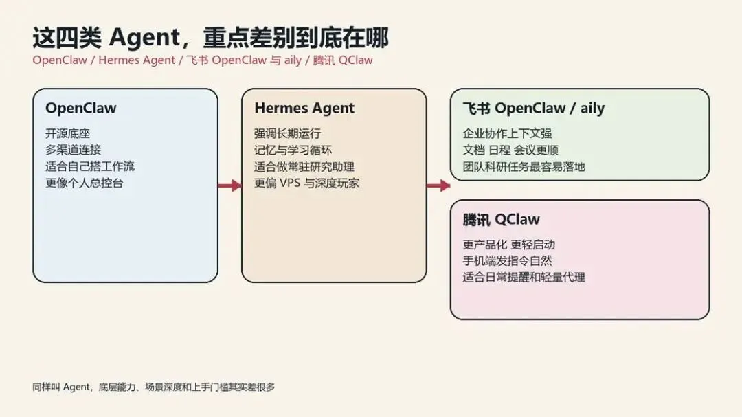 这两周如果你在刷 AI 圈,应该很难绕开几个名字:`OpenClaw`、`Hermes Agent`、飞书的 `OpenClaw / aily`,以及腾讯刚推向海外测试的 `QClaw`。
