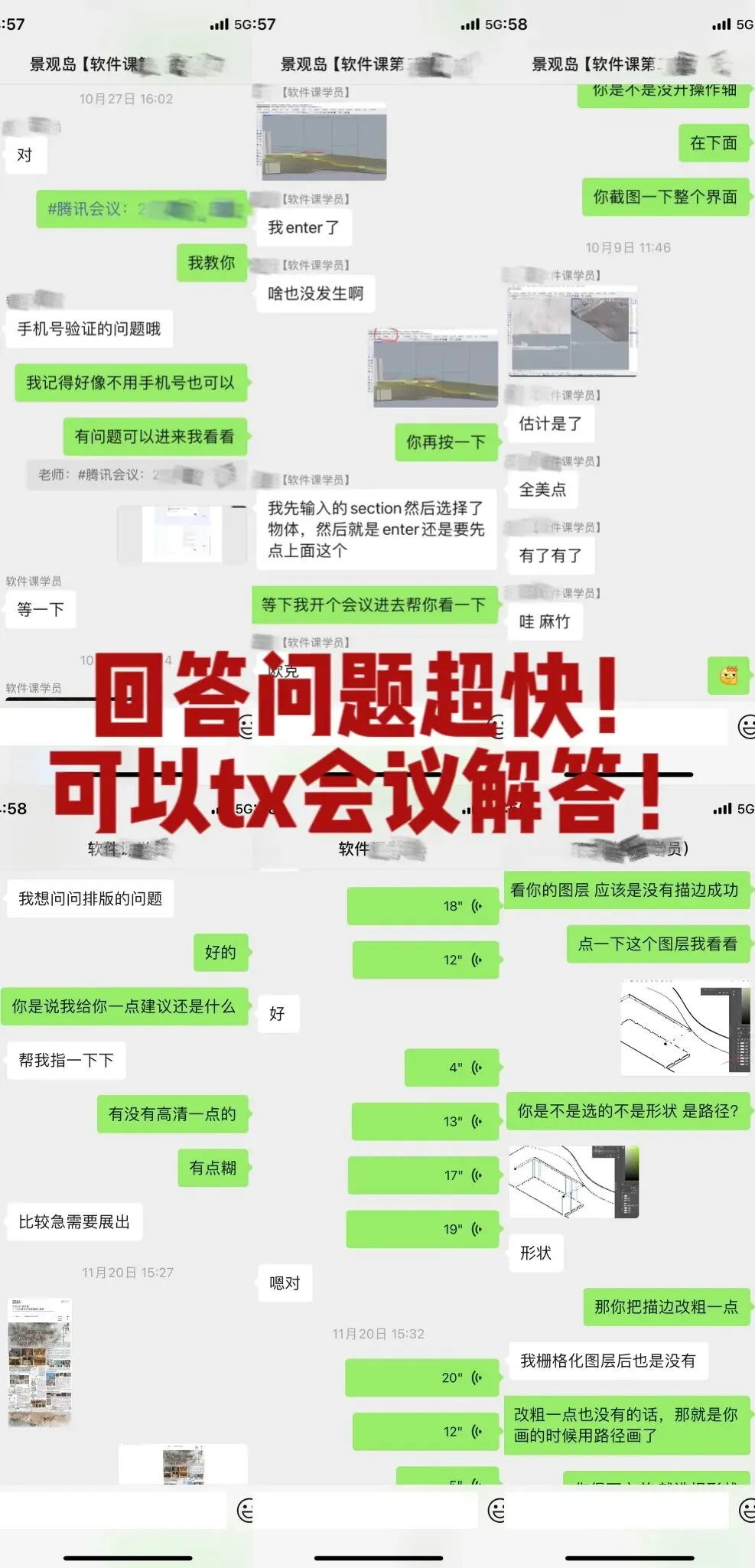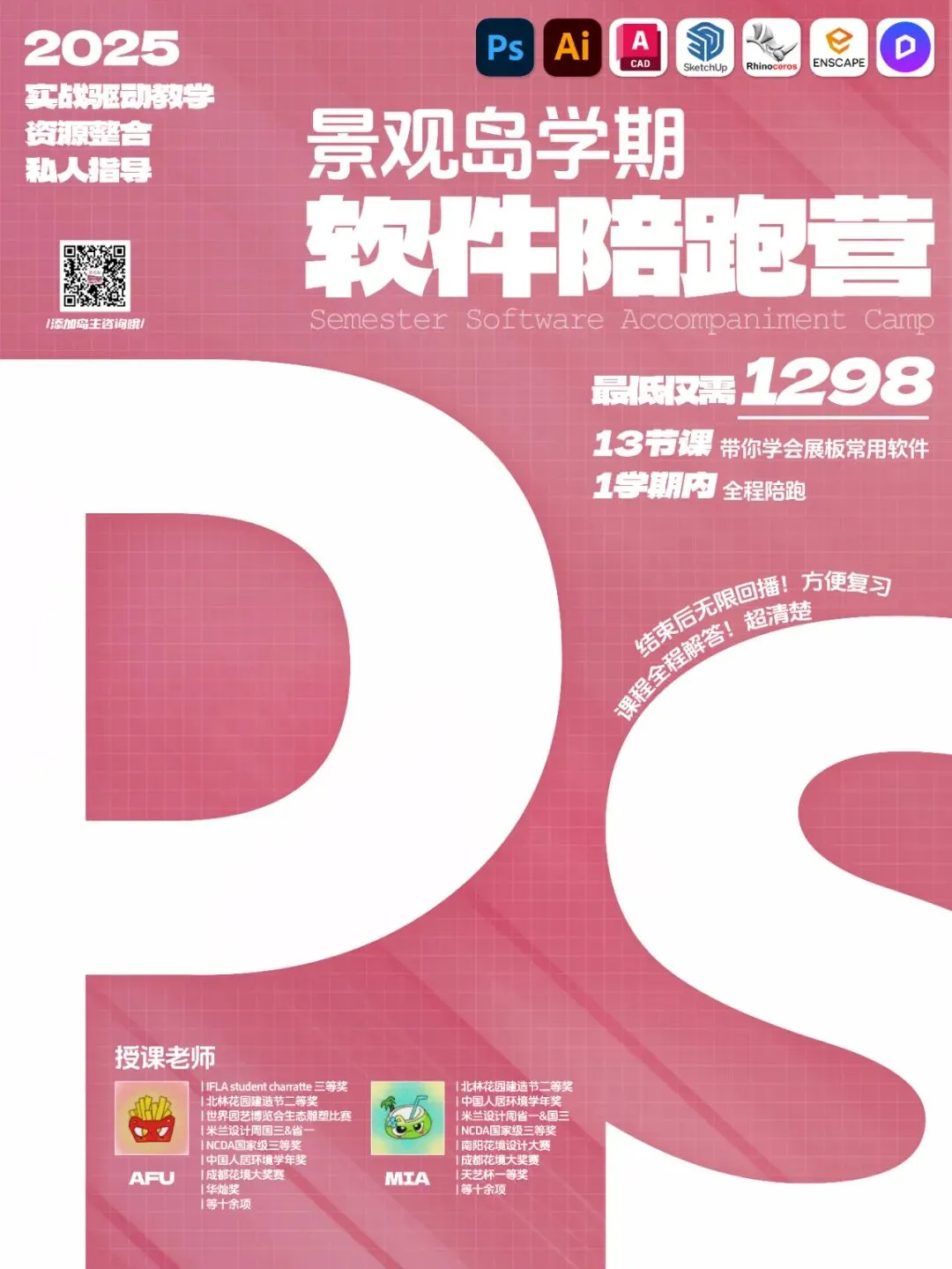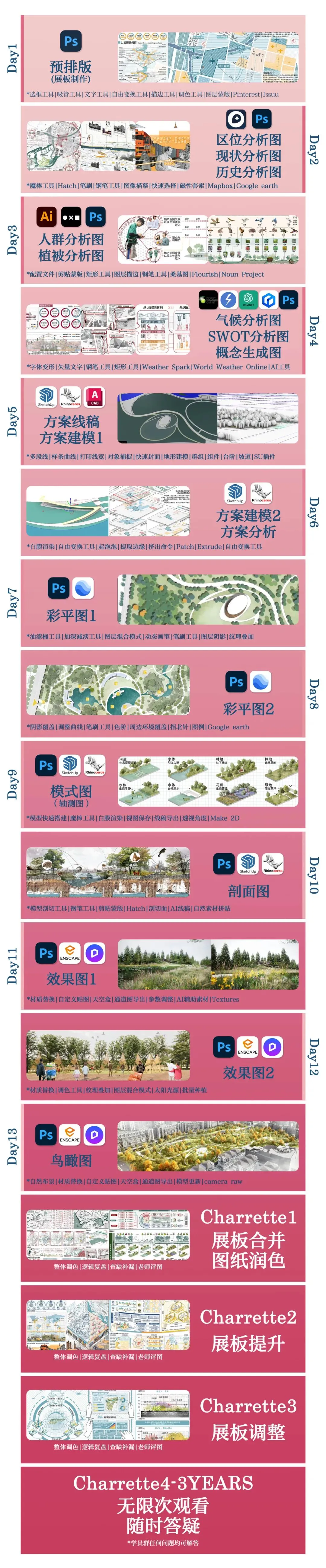 课程按照“预排版-前期分析-方案平面-策略展示-效果表达”的逻辑链进行系统教学。同学可以根据自己的时间进行课程的自主学习,晚上老师会发送答疑链接。每个人的学习能力不同,因此每个软件从认识到熟悉的快慢会有差异,任何问题都可以向我们的老师提问。
