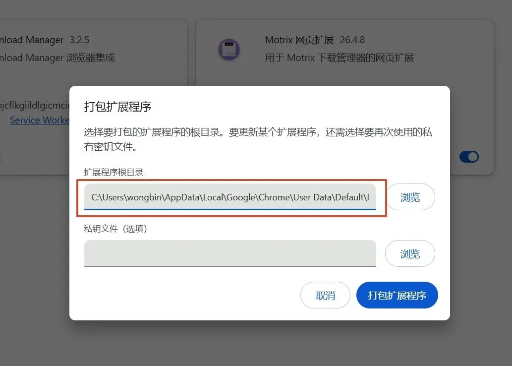 选择打包扩展程序,在下面粘贴完整的插件路径,选择打包扩展程序。