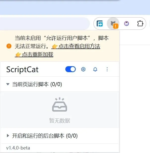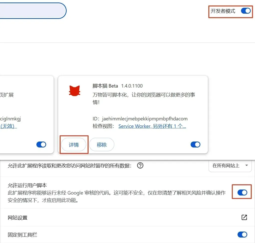 我们先打开开发者模式 → 再选择插件详情 → 打开运行用户脚本。可以发现猫咪变成了红色,感叹号也消失了。这个时候就可以正常使用了。