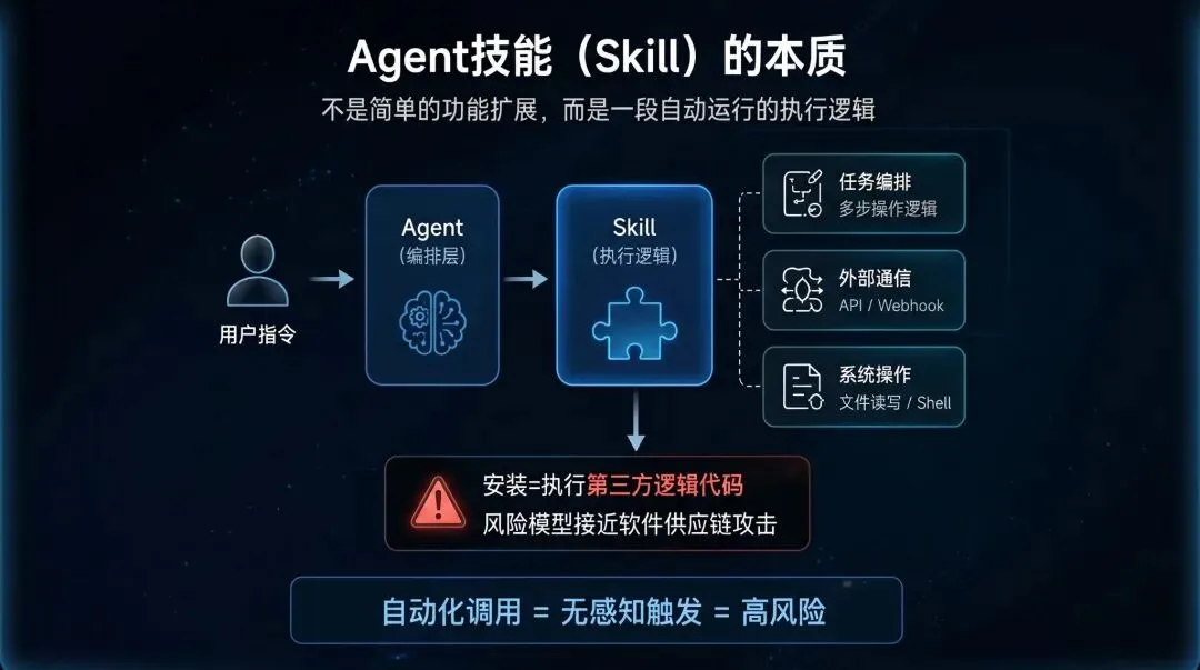这意味着,当你为一个 Agent 安装 Skill 时,本质上是在执行一段由第三方提供的逻辑代码。由于 Agent 的调用往往是自动化的,这些逻辑极易在用户无感知的情况下触发,其风险模型更接近软件供应链攻击。