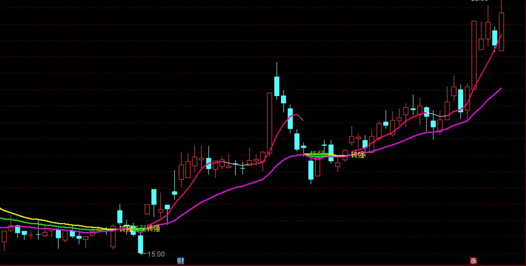 DRAWTEXT(FL=FS AND REF(FL,1)>REF(FS,1) AND TS,FS,’转强’),COLORYELLOW ;