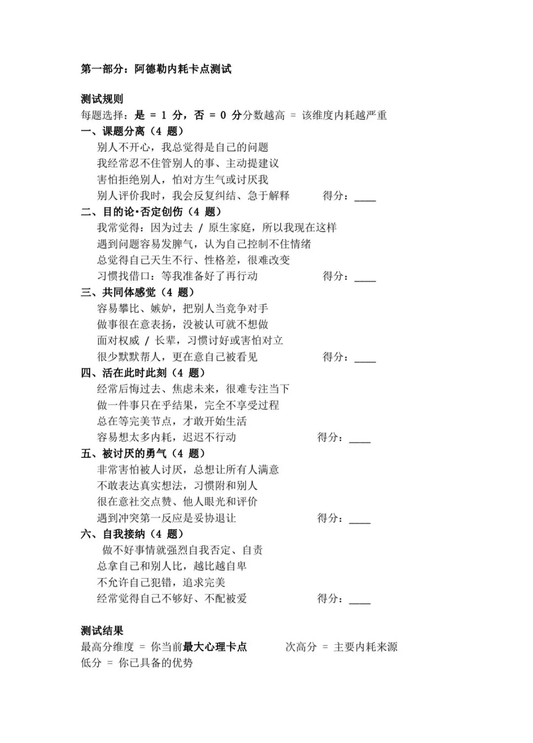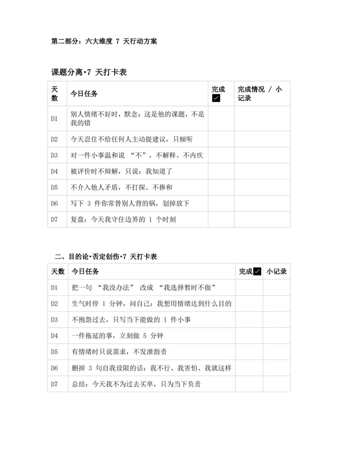 拆解成6大维度+24道卡点自测+6套7天打卡表,从课题分离、自我接纳,到拥有被讨厌的勇气,直接执行。