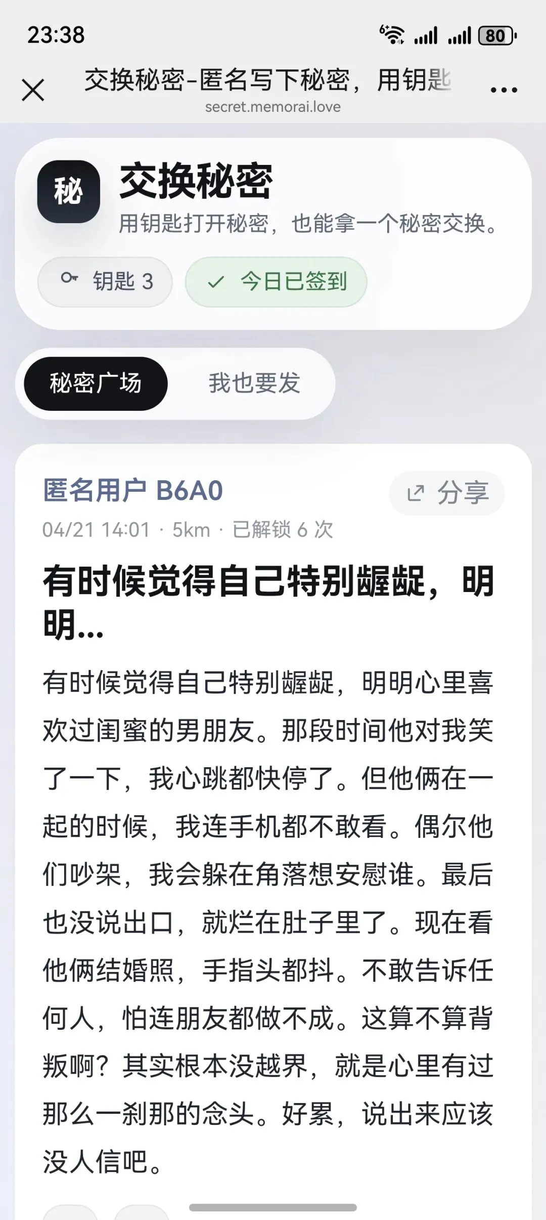 帮我做一个匿名分享秘密的网站,每个秘密生成一张卡片,需要一把钥匙才能打开。