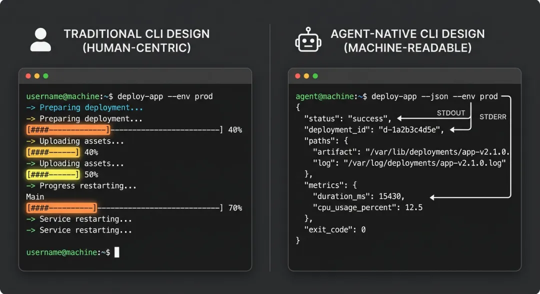传统 CLI 设计有一个默认假设——用户是人类。所以会有华丽的进度条、友好的错误提示、交互式确认。但 Agent 不需要这些,它需要的是机器可解析的干净输出。