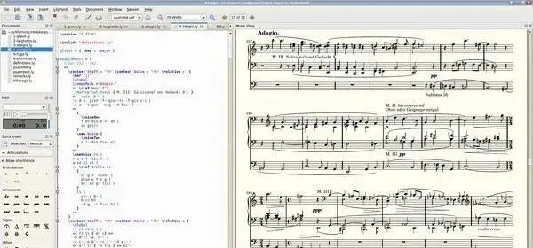 日常干活也能各种骚操作:Snippet Manager 存文本片段/模板/脚本,多个版本的 LilyPond 自动帮你选对的那个。内置LilyPond文档浏览器和帮助,可配置的文档大纲视图让你翻大型乐谱不迷路。还支持智能布局控制(比如给 PDF 里的特定对象上色),能用 LilyPond 自带工具导入 ABC、Midi 和 MusicXML,甚至实验性地导出到 MusicXML。整个现代化的用户界面,颜色、字体、快捷键都能自己调,老手小白都说香。