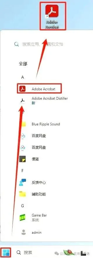 7.从开始菜单将【Adobe Acrobat】图标拖至桌面建立快捷方式。
