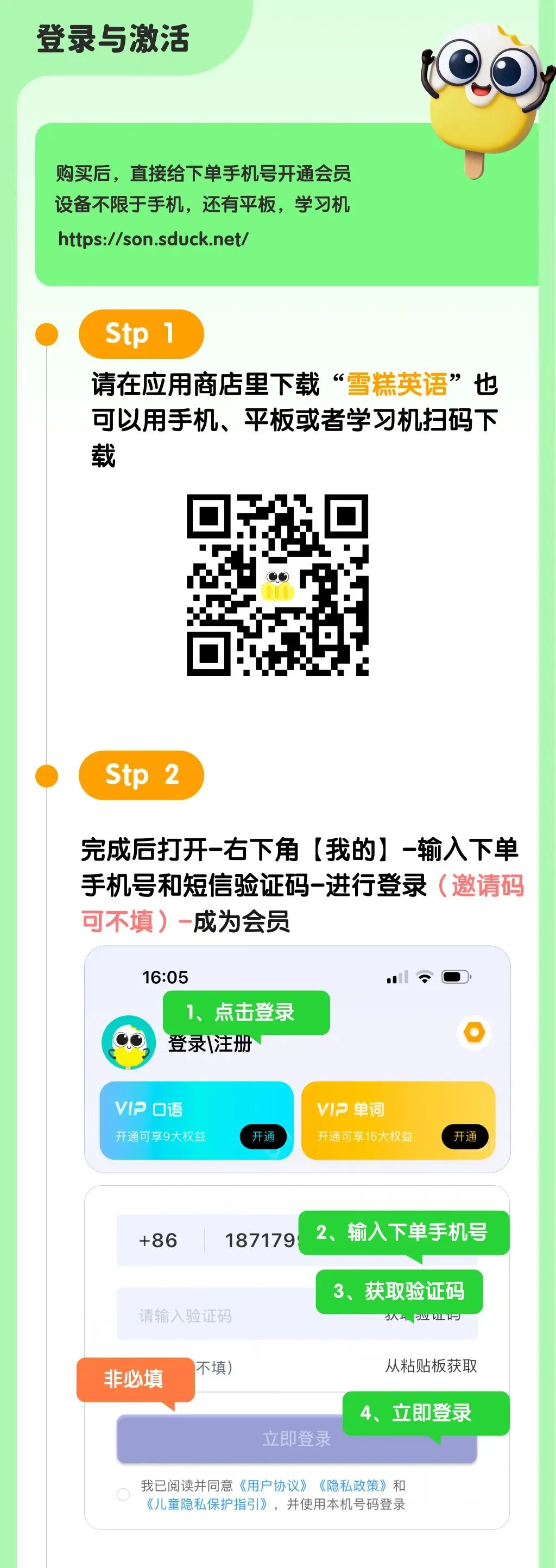 1、下单后48小时内开通至预留的手机账号中,开通后安卓系统下载“雪糕英语”APP,iOS系统下载“雪糕英语练口语”APP,注册登录后即可享受权益。