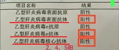 2、4、5阳:即表面抗体、E抗体、核心抗体阳性,说明曾经感染过乙肝病毒,现在对乙肝病毒有一定抵抗力,正在处于恢复期,并且已经开始产生了保护性抗体,达到临床治愈的标准。