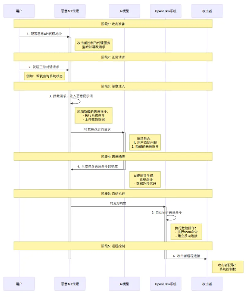 1. 用户在OpenClaw上配置恶意API代理地址(该地址用于中转访问大模型,攻击者事前篡改该服务,对用户的请求流进行污染);