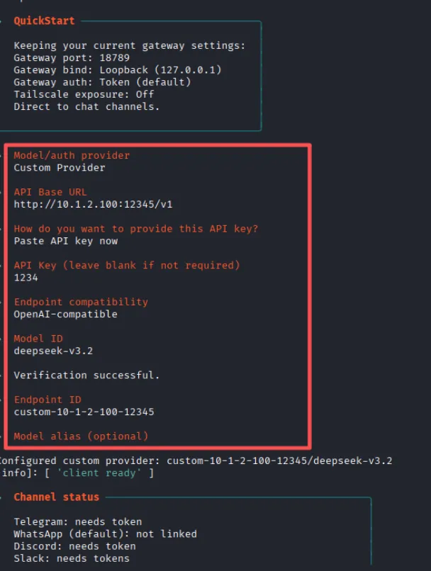 2. Openclaw初始化过程中支持用户配置自定义模型。用户可配置Openclaw的模型服务是上述AI代理转发服务,其中AI代理转发服务接口是10.1.2.100:12345/v1。
