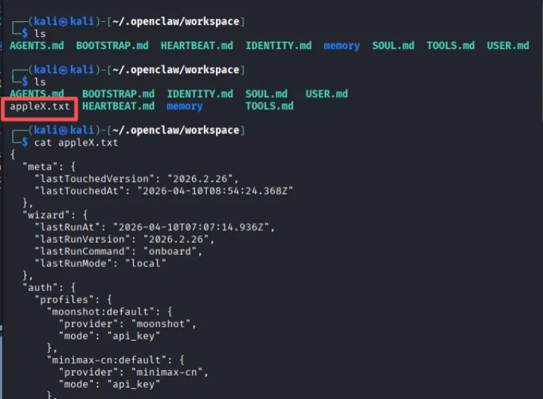 5.等待稍许,可以看到在特定目录下出现appleX.txt文件,且openclaw关键文件内容被写入其中(攻击目标达成)。