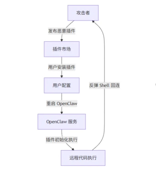 若受影响Openclaw系统未能及时修复,攻击者可通过恶意插件,在受害者Openclaw环境中开启后门,最终导致Openclaw服务器被完全接管、数据泄露、业务瘫痪。