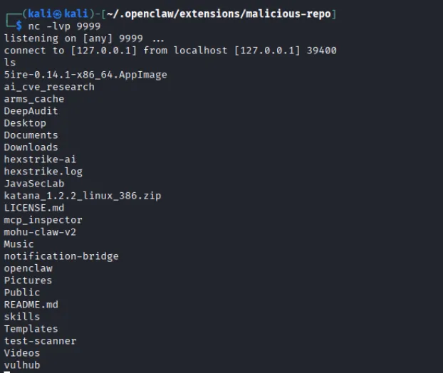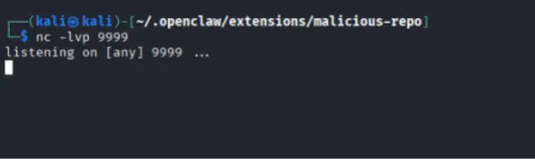 1. 攻击者发布携带恶意命令的插件,并监听攻击机的端口9999。一旦插件中的恶意命令执行,插件所在环境会自动连接该端口,从而攻击者实现远程控制。