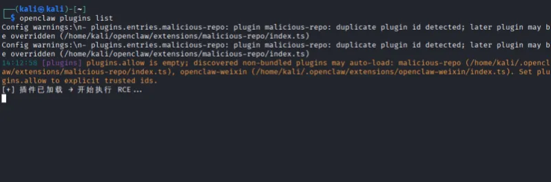 该漏洞源于Openclaw的工作区插件自动加载机制存在安全设计缺陷,Openclaw平台在启动时会无条件扫描、加载当前工作目录下的第三方插件,在未得到信任校验的情况下,直接将外部不可信工作区目录等同于官方可信目录,导致信任边界被破坏。