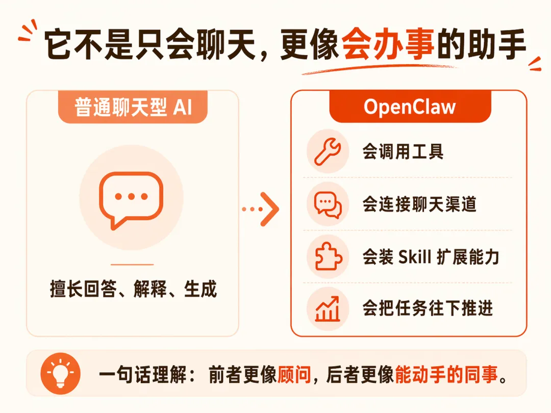 图 1|聊天型 AI 和 OpenClaw 的差别,不在“更会说”,而在“会不会继续往下做”。