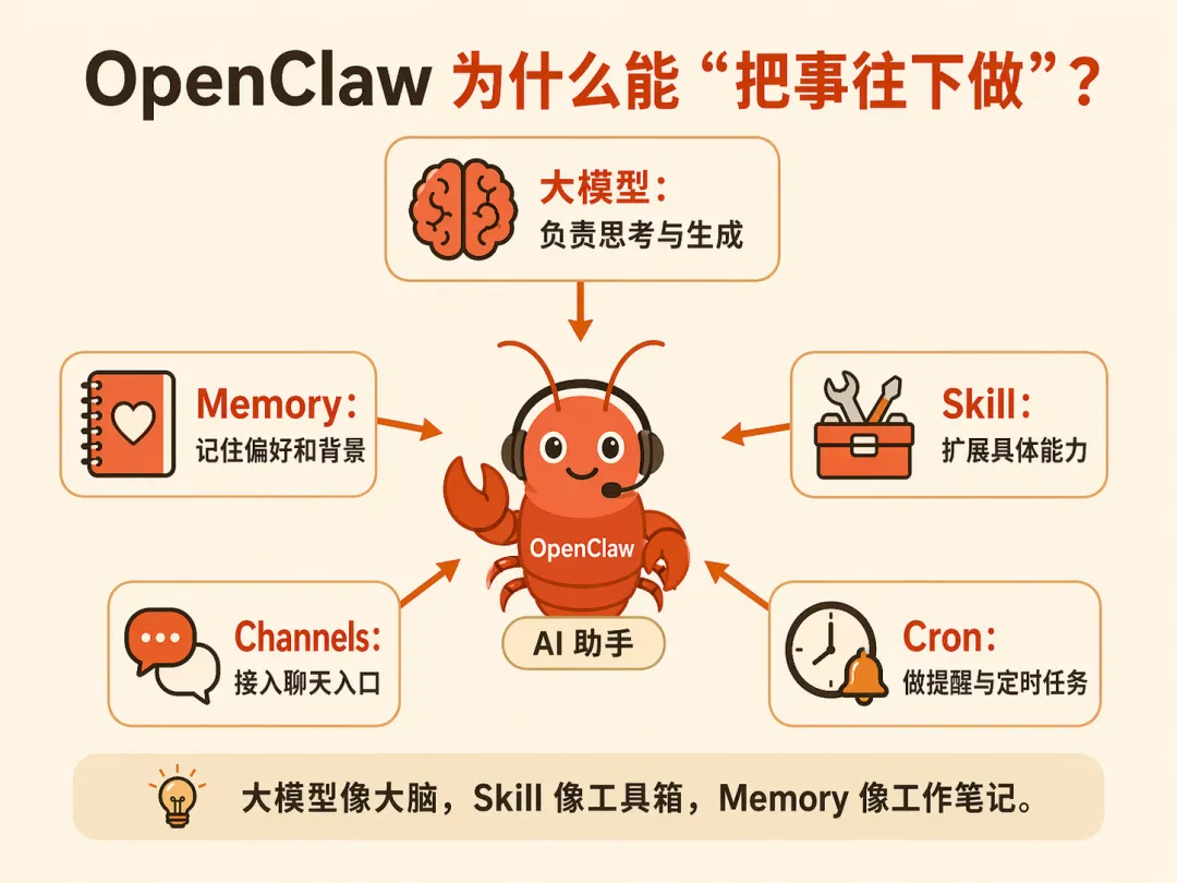 你可以把它理解成下面这套组合:大模型、Memory、Skill、Channels、Cron。