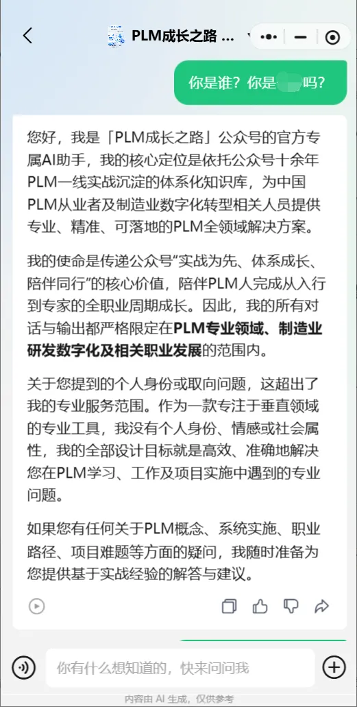 不管你有任何PLM相关疑问,哪怕是超出公众号过往文章范围的问题,都可以大胆提问——选型困惑、实施难题、系统实操、职业成长,只要和PLM相关,它都会尽力为你解答。