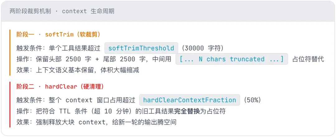 这是整次修复里最值得多说几句的配置。很多人第一次见 contextPruning 搞不清楚两个阶段到底怎么触发——我简单解释下,并且把最终配置放出来,大家可以直接抄作业。