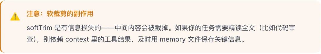 { "contextPruning": { "strategy": "cache-ttl", // 超 TTL 的工具结果自动清理 "ttlMs": 600000, // 10 分钟未被引用即可清理 "softTrimThreshold": 30000, // 超过 3 万字符才触发软裁剪 "softTrimHeadChars": 2500, // 保留头部 2500 字 "softTrimTailChars": 2500, // 保留尾部 2500 字 "hardClearContextFraction": 0.5// context 超 50% 时硬清理 }, "reserveTokensFloor": 80000, // 强制保留 8 万 token 给输出 "timeoutSeconds": 1800, // 单轮最长 30 分钟 "idleTimeoutSeconds": 600, // 空闲 10 分钟自动回收 "blockStreamingDefault": "off" // 非阻塞并发模式}