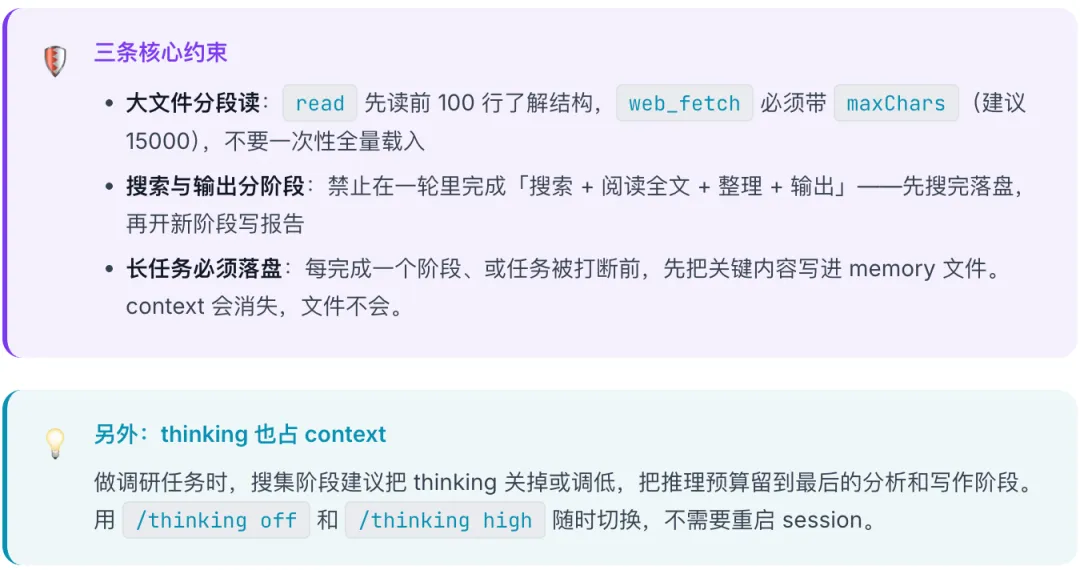 调研任务要抓大量网页,每次 web_fetch 都往 context 里塞几千字。跑着跑着,context 窗口被工具结果越来越挤。如果没有额外的输出预留策略,工具结果会持续挤占可用空间,任务一长就更容易把模型的回复空间吃掉——这次排查里就是这个情况。