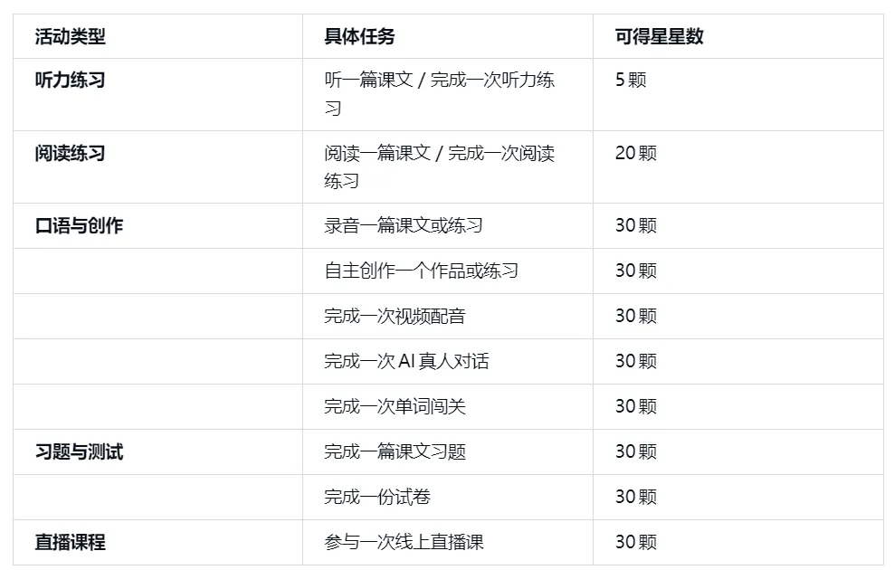 每日上限:学员每天通过上述活动可获得的星星总数上限为 800颗。