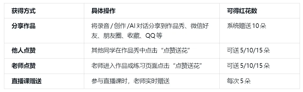 – 50朵红花 = 1积分