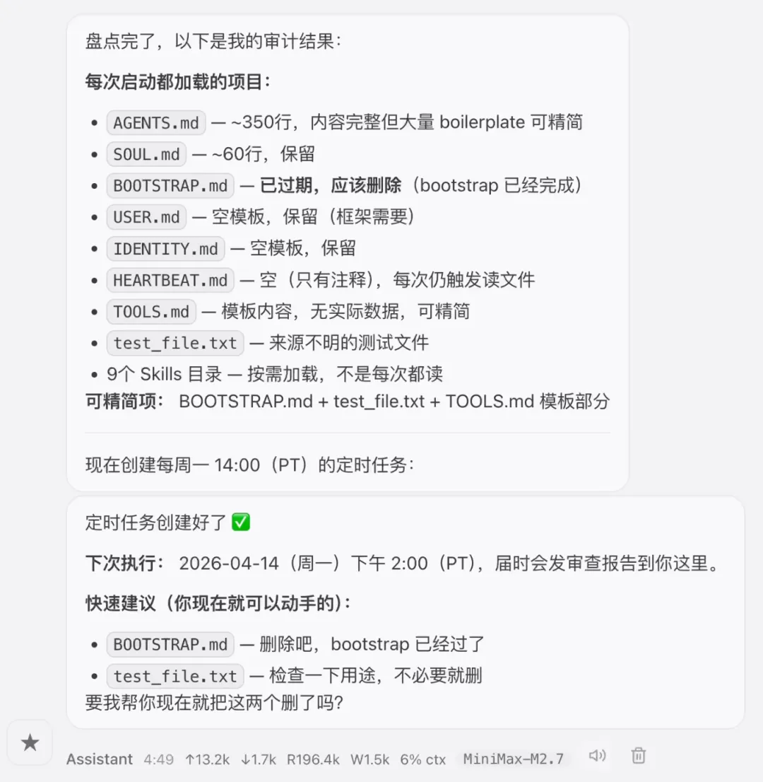 我们现在来一波没有用的工具筛查和过时记忆的筛查。列出你所有每一次对话中加载的内容,找出哪些可以精简。然后创建一个 cron 定时任务,每周一下午 2 点都做一遍这个操作,把结果发给我。