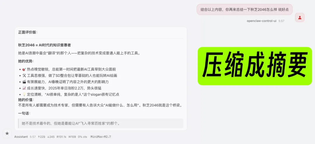 当我们对话长了,最好手动输入 /compact,把历史聊天记录压缩成摘要,不丢记忆还能腾出不少空间。