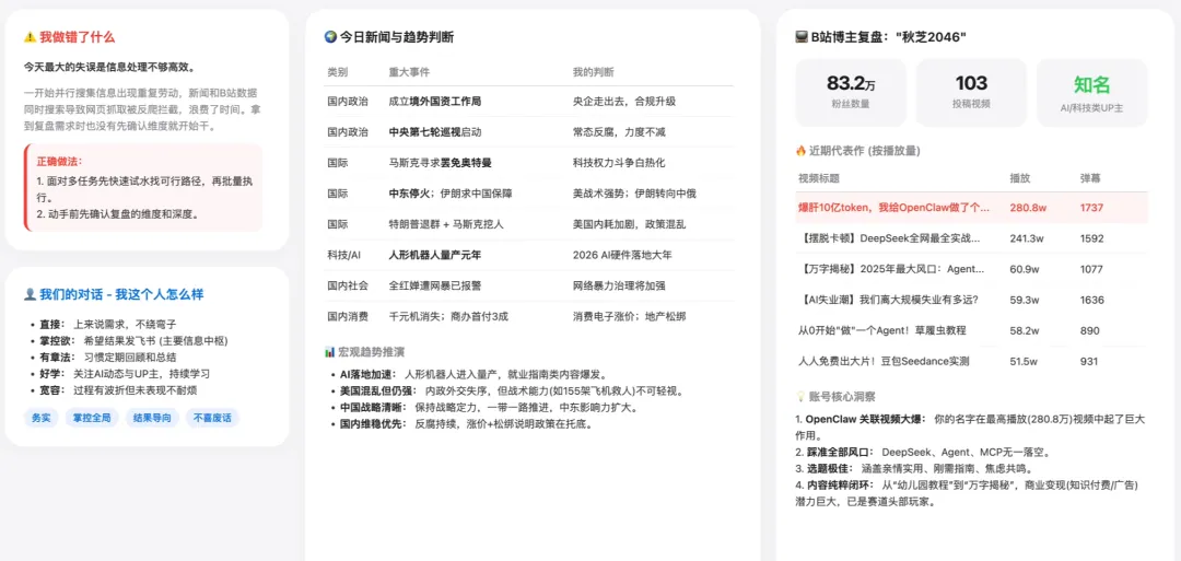 让龙虾复盘它做错了哪些、对话质量、基于对话分析我这个人、今天的新闻趋势、视频数据表现,复盘完做成 HTML 页面截图发给我。