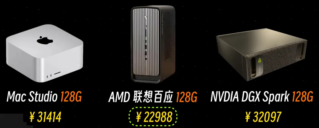 除了我这个 AMD 联想百应,同类流行的还有 Mac Studio,还有英伟达的那个DGX Spark。