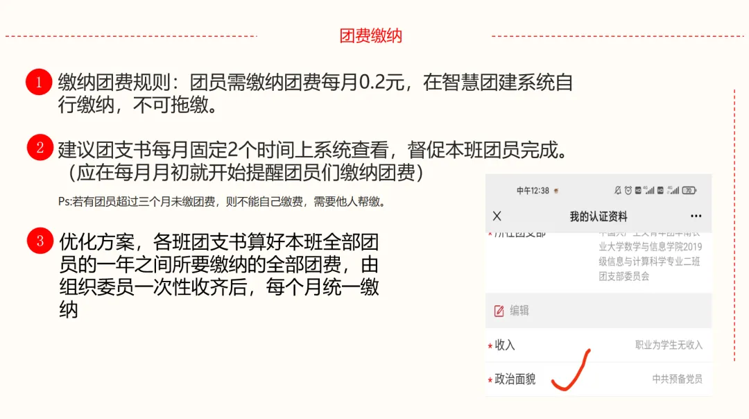 团员身份保留至28岁,入党后同时保留团员身份,但可以通过更改智慧团建上的认证资料,把政治面貌改为中共预备党员/中共党员,团支书审核通过即可不用缴纳团费。对于转专业和复读的学生,可自行在智慧团建上修改团籍认证信息,团支书及时审核通过。团支书要不定时登陆智慧团建查看消息通知,及时审核团费缴纳情况,请各团支部以班级智慧团建上缴纳团费的情况为准,及时查看自己班级的团费缴纳情况,如果还有未缴纳团费的同学要督促提醒。