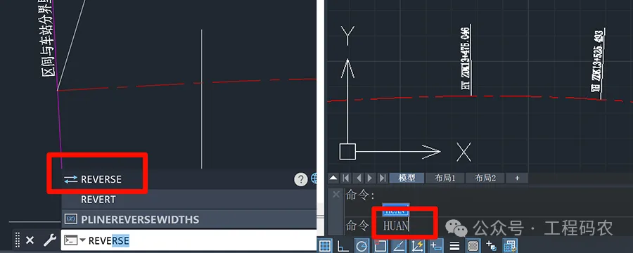 里程标注方向与多段线方向一致,多段线方向不为里程前进方向的,在AutoCAD中可以使用 REVERSE 命令进行换向,有CASS的也可以使用 HUAN 命令。