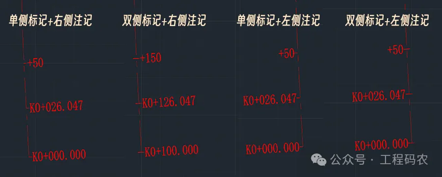 里程标记线支持 单侧、双侧 2种标记方式,里程注记文本支持 左侧、右侧 2种注记方式,共4种类型。
