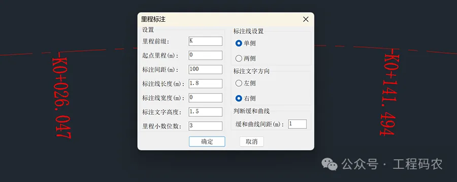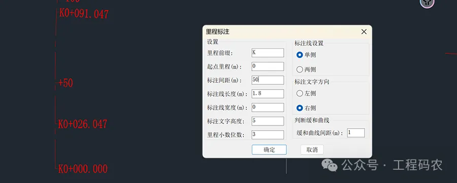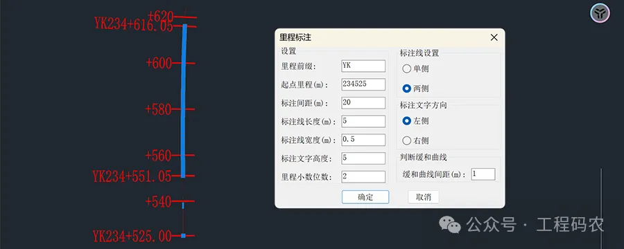 支持里程前缀,标注间距 ,标注线的长度、宽度,里程文本的高度等参数的自定义。