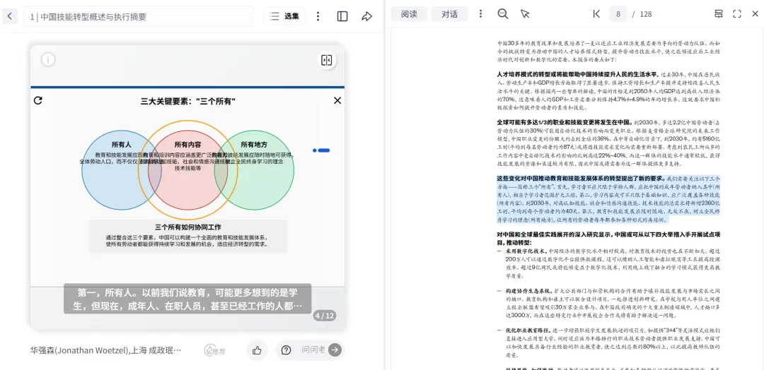我偏爱把它作为行业数据/学术知识的搜索引擎,有文库、文献、播客等多种搜索源,能搜中英文文献,而且内容规范靠谱,多语言文献可翻译阅读,加上PPT+音频讲解,让我能够快速深入学习到很多知识。