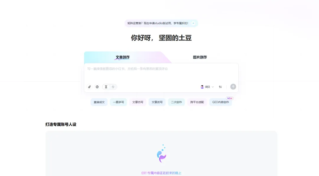 在这里能够一站式完成“选题—创作—优化—发布—分析”全流程内容创作,是自媒体运营的爆款神器。在平台上添加小红书、公众号、视频号、头条等账号人设,之后文章创作就能基于人设生成精准垂类内容。而且可以查看账号数据和热门选题。