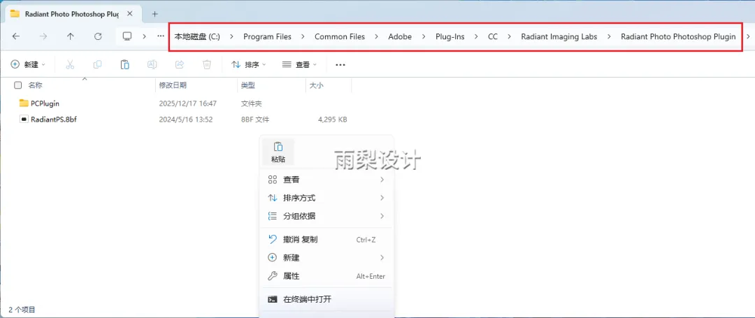 10.复制【RadiantPS.8bf】粘贴到【C:\Program Files\Common Files\Adobe\Plug-lns\CC\Radiant Imaging Labs\Radiant Photo Photoshop Plugin】
