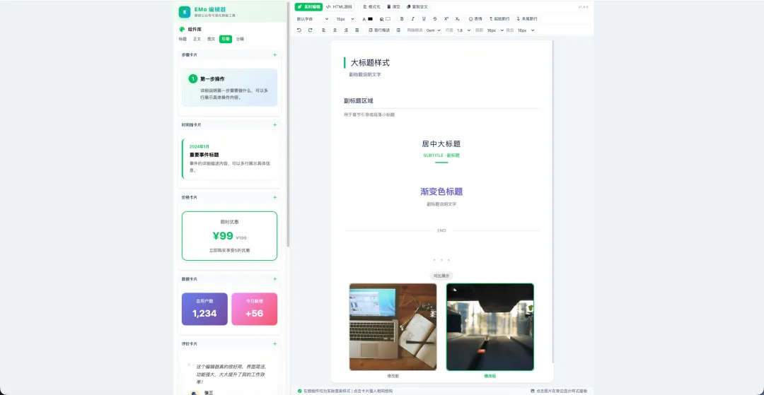组件自定义:用户可保存当前选中内容的样式为新组件,实现个人模板库。