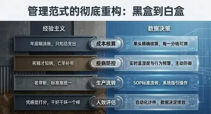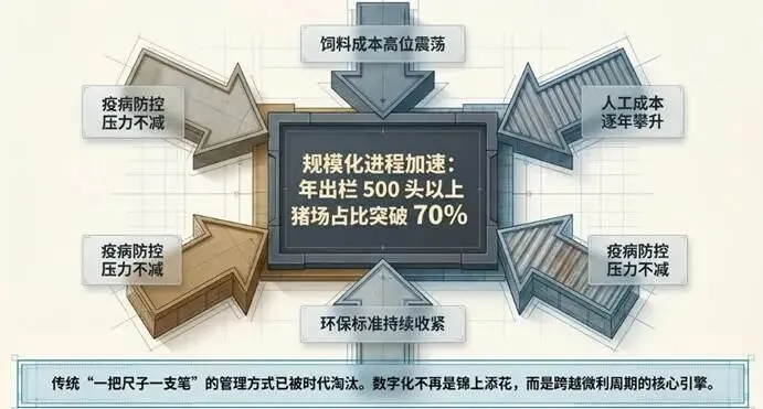 一边是行业周期的深度调整:饲料价格高位震荡、人工成本逐年攀升、环保标准持续收紧、疫病防控压力不减;另一边是规模化进程的加速推进,年出栏 500 头以上的猪场占比已突破 70%,传统 “一把尺子一支笔” 的管理方式,正在被时代无情淘汰。
