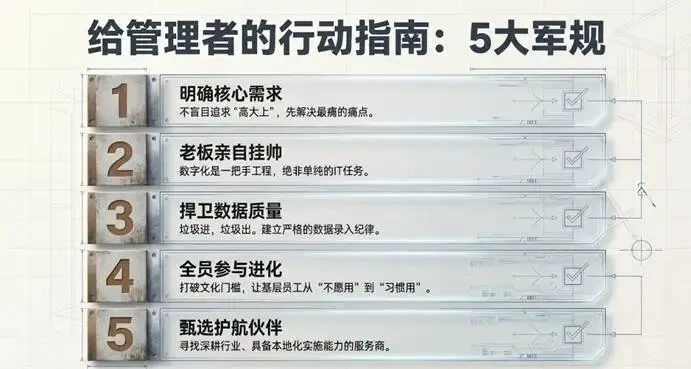 数据是数字化管理的基础。如果数据不准确、不完整,那么系统生成的报表和分析报告就没有任何意义。因此,必须建立严格的数据录入制度,确保数据的准确性、完整性和及时性。