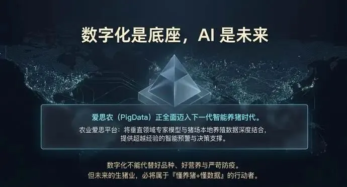 2024 年,PigData 猪场管理系统在第四届猪产业发展大会上荣获 “2023 年度养猪行业匠心产品 + 智能养猪奖“,得到了行业专家和企业的广泛认可。近年来,爱思农还在积极探索人工智能技术在养猪行业的应用,推出了农业爱思平台,将垂直专家模型与本地养殖数据相结合,为用户提供更智能的数据分析和决策支持。